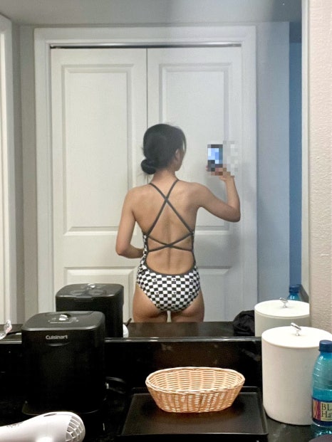뒷부분은 더블 크로스 스트랩으로 되어 있어요. 르망고 체리쉬보다 끈이 얇은 편이지만, 신축성이 좋아 혼자서도 쉽게 입고 정리할 수 있었어요. 보통 두 겹으로 된 수영복은 몸을 꽉 잡아주는 대신 살짝 불편할 수 있는데, 이 제품은 한 겹이라서 그런 부담이 전혀 없어요!